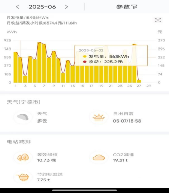 项目实行“自发自用、余电上网”模式,预计年发电量约30万度,可满足酒店90%用电需求,年省电费约10万元,降低运营成本。多余电力并网,既支持区域能源供应,又为酒店创造额外收益,实现能源利用最大化。